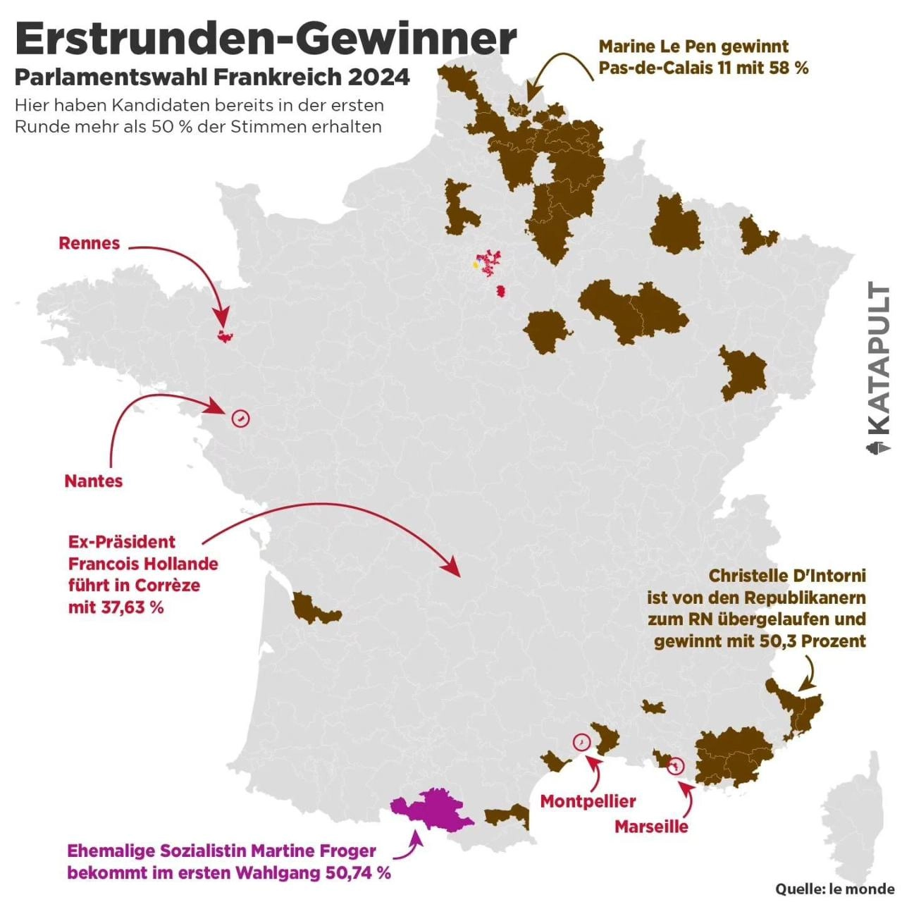 Die Rechtsextremen des Rassemblement National (RN) gewinnen die erste Runde der französischen Parlamentswahl mit 29,3 Prozent, bleiben aber deutlich hinter den letzten Umfragewerten und auch den ersten Hochrechnungen zurück.
